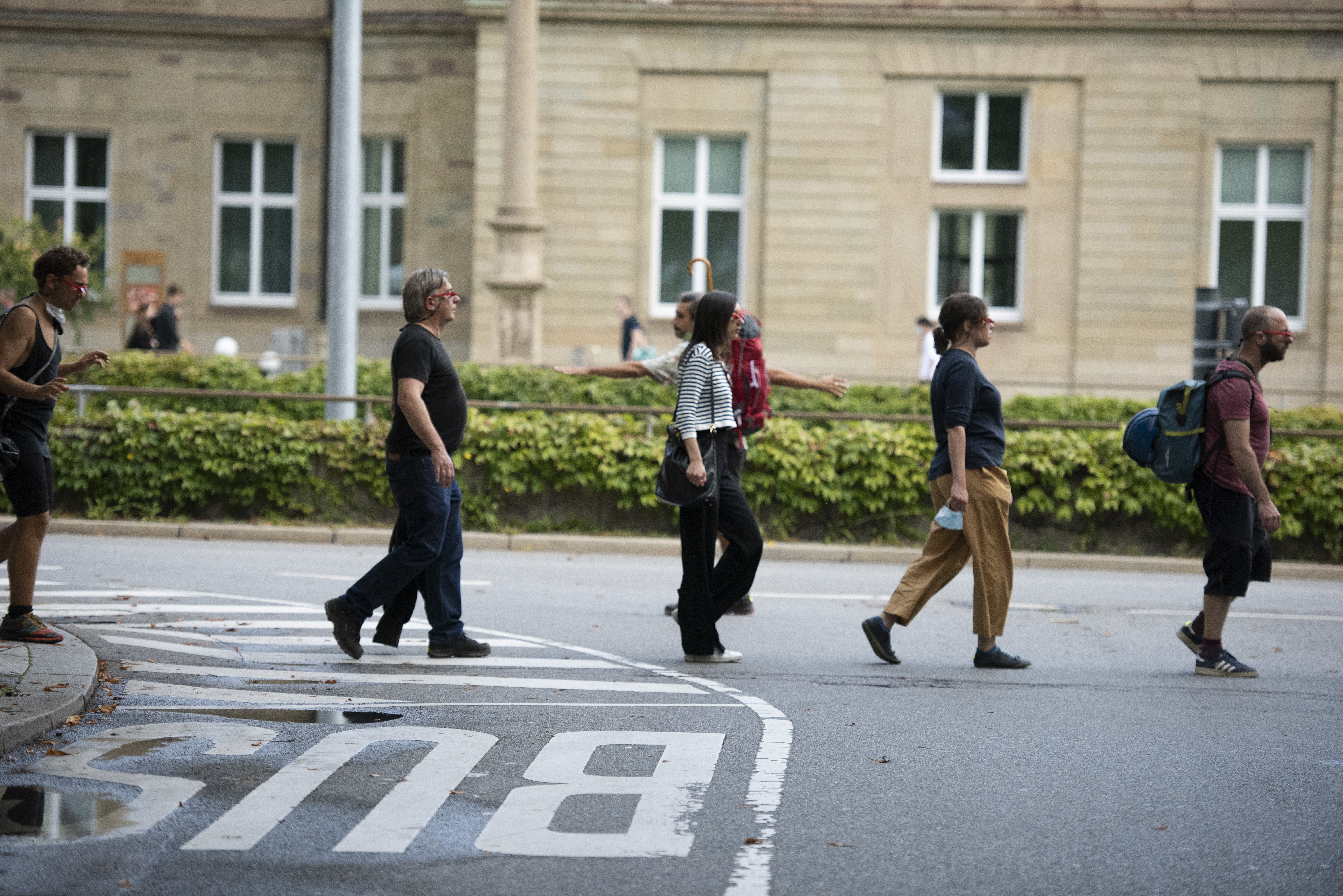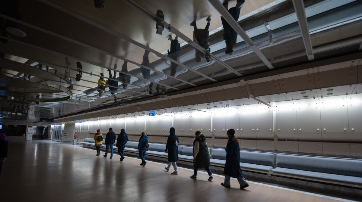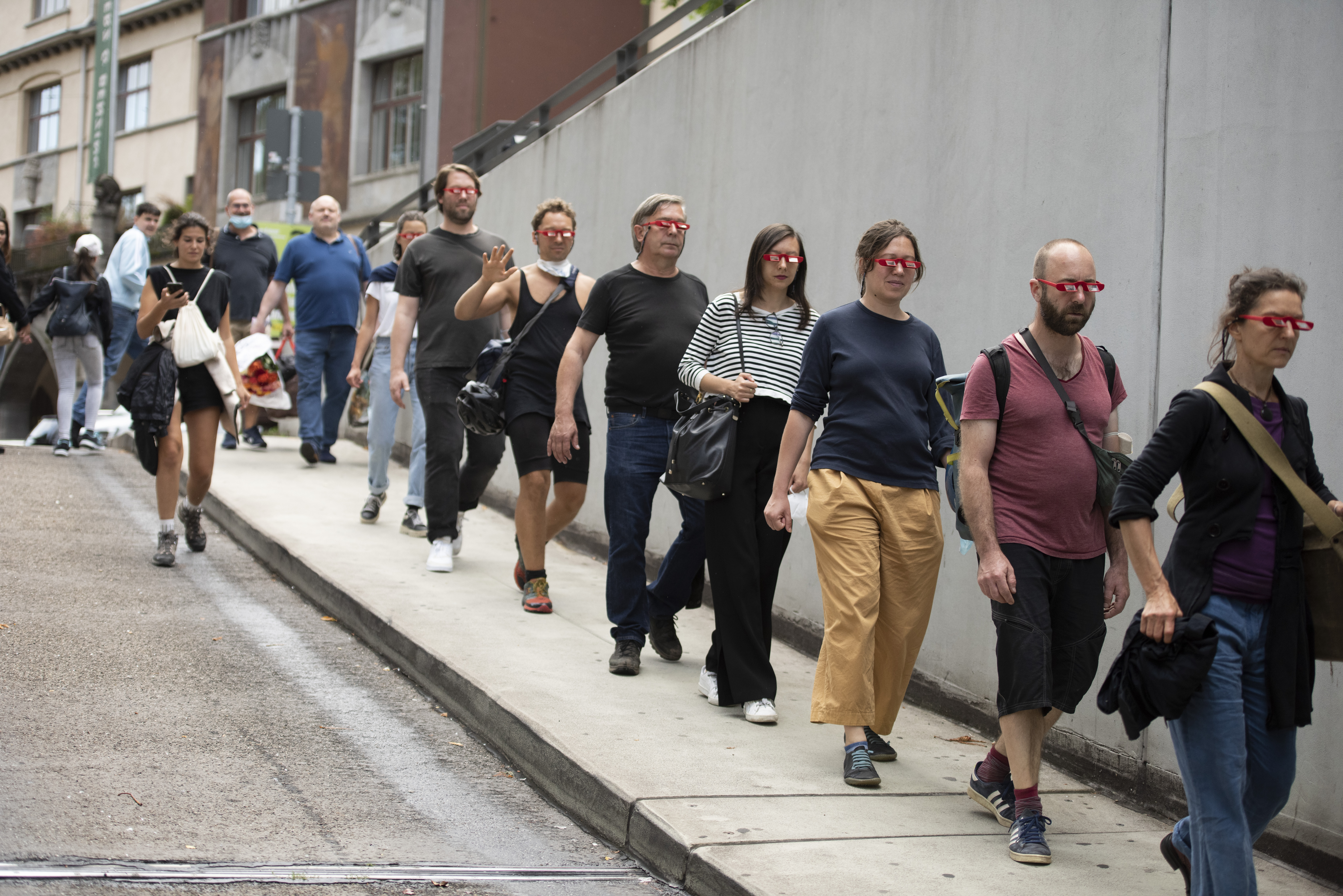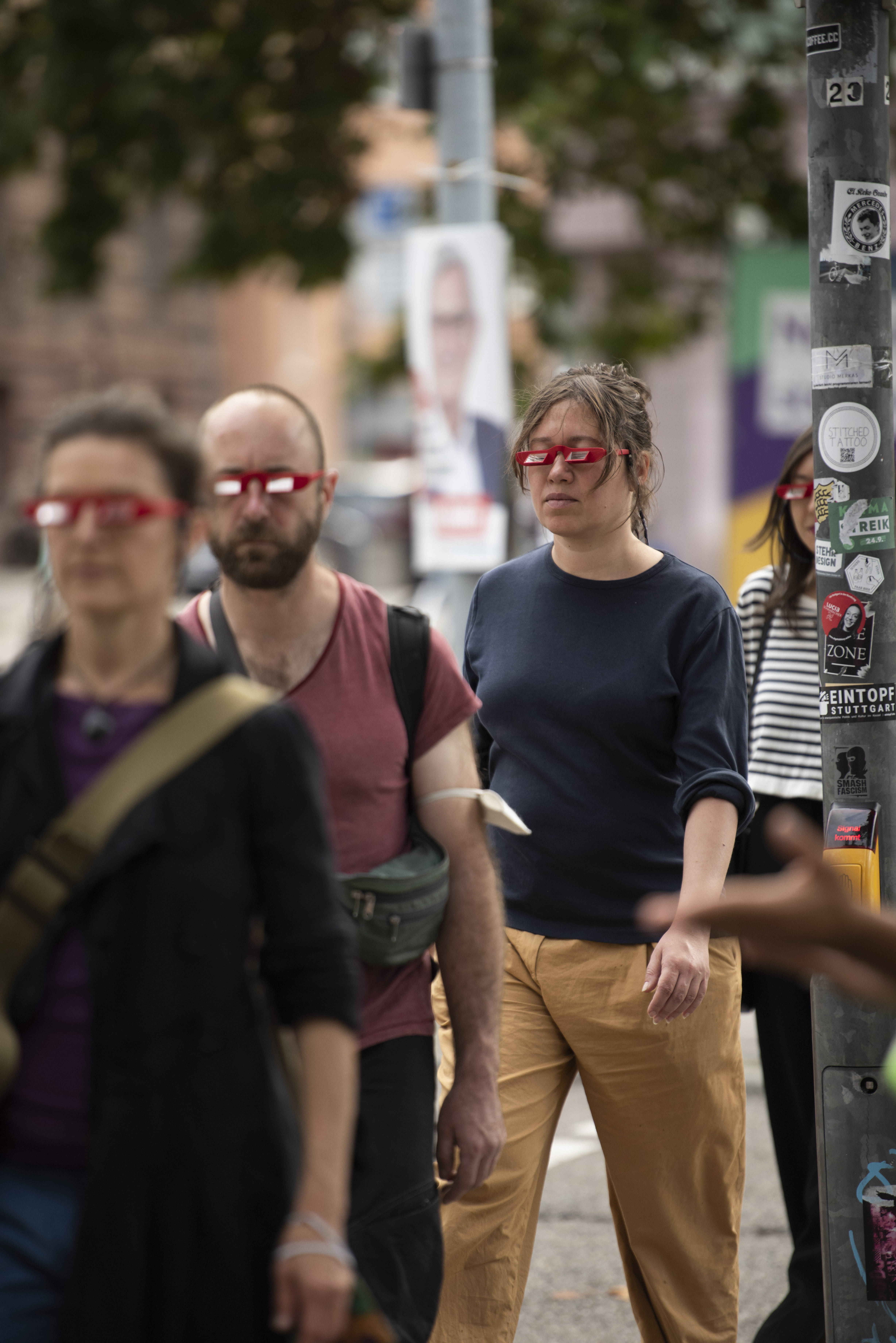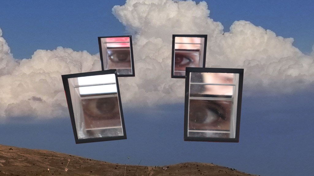 What should be an access point to diverging from rationality, became a low-tech cinematic experience made of three elements; a walk route, a series of mirror goggles to look up, and a music composition.